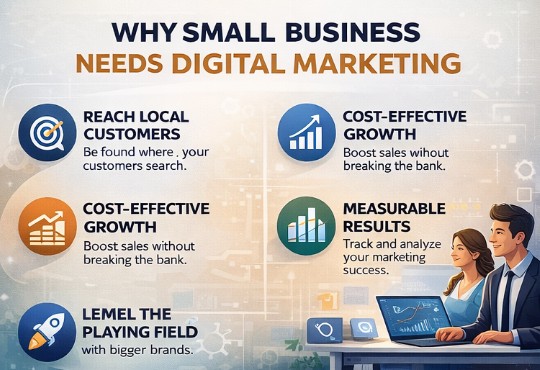 Small businesses need digital marketing to reach online customers, increase visibility, and generate more sales at a lower cost.